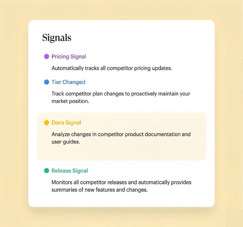 Don't drown in endless changelogs and spreadsheet data. SignalDO's AI engine instantly analyzes pricing shifts, feature releases, and doc updates to deliver concise summaries. Understand why they made the change, what it means for the market, and how you should react.